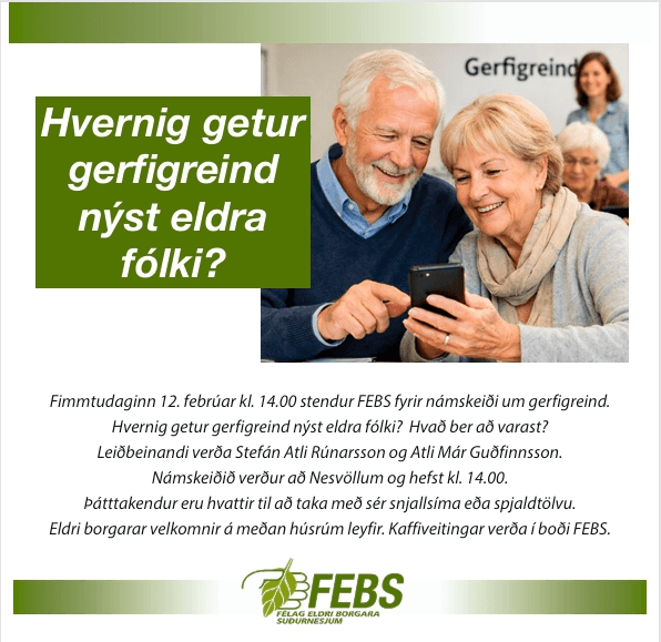 Annað áhugavert Lesa meira FréttirAÐALFUNDUR FEBS 202629 mars, 2026 Lesa meira FréttirVeðurviðvörun20 mars, 2026 Lesa meira FréttirÞORRABLÓT 202626 janúar, 2026 Lesa meira FréttirFRÆÐSLA UM OFBELDI GAGNVART ELDRI BORGURUM14 janúar, 2026 Lesa meira FréttirFélagsfundur FEBS5 janúar, 2026